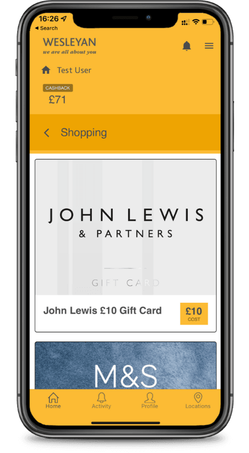 Customers can then use their points to receive cashback and buy digital gift cards at popular retailers (John Lewis, Marks and Spencer, Adidas…). The solution was embedded into our off-the-shelf loyalty mobile app, branded to Wesleyan.